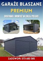 Garaż blaszany w kolorze grafit z bramą uchylną i dodatkami