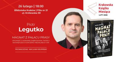 Zapraszamy na spotkanie autorskie i wręczenie nagrody Krakowska Książka Miesiąca. W lutym laureatem został Piotr Legutko i jego książka Magnat z Pałacu Prasy. Opowieść o Marianie Dąbrowskim, twórcy największego koncernu medialnego II RP.