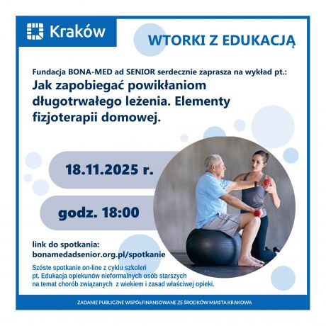 Serdecznie zapraszamy wszystkie osoby opiekujące się osobami starszymi i seniorów na wykład on-line pt.: Jak zapobiegać powikłaniom długotrwałego leżenia. Elementy fizjoterapii domowej.