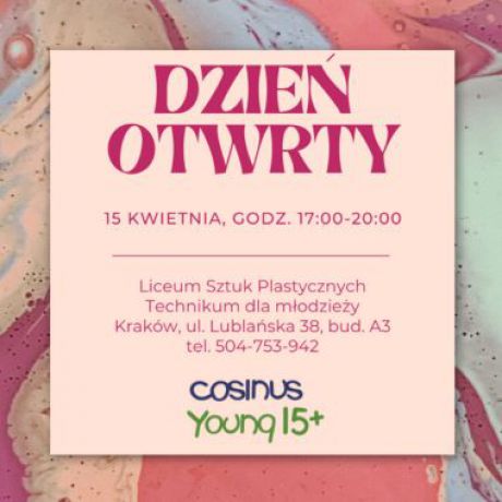 Wydarzenie jest częścią dnia otwartego Liceum Sztuk Plastycznych Cosinus w Krakowie. Będzie także doskonałą okazją, by poznać atmosferę szkoły, spotkać artystów i pasjonatów sztuki oraz wziąć udział w inspirujących warsztatach i spotkaniach.