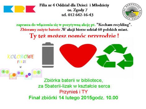 W Oddziale dla Dzieci i Młodzieży odbędzie się finał akcji – „Kocham recykling 2015”- zbieramy baterie i bateryjki-!. Idea akcji jest prosta, przynieś baterie do biblioteki i pomóż przyrodzie oraz sobie. Biblioteka zaprasza do włączenia się w akcję wszystkich mieszkańców Nowej Huty i nie tylko… Bądź eko ! Za każde 5-baterii lizak w kształcie serca przez cały miesiąc!