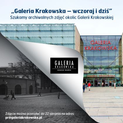 Z okazji 10. urodzin Galeria Krakowska zaprasza mieszkańców Krakowa do współtworzenia wystawy zdjęć, pokazującej, jak zmieniała się ta przestrzeń w przeciągu ostatnich lat. Będzie ona podzielona na 3 części: kontekst historyczny miejsca, okres PRL-u oraz zdjęcia po 1989 roku aż do współczesności. Fotografie dokumentujące tamte miejsca można nadsyłać do 22 sierpnia na adres mailowy: pr@galeriakrakowska.pl. Spośród nadesłanych zdjęć, wybranych zostanie pięć, które będą zaprezentowane podczas wystawy, a ich autorzy otrzymają bony o wartości 100 zł do Galerii Krakowskiej.