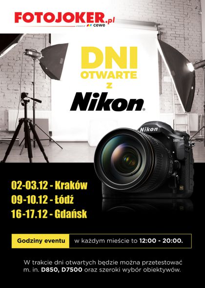 Każdy, kto odwiedzi salon FOTOJOKER w Galerii Krakowskiej dniach 2-3 grudnia (godz. 12.00-20.00) będzie mógł „pobawić się” m.in. aparatem Nikon D7500 i najnowszym D850 oraz przetestować szeroki wybór obiektywów.