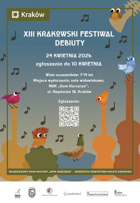 Zapraszamy dzieci i młodzież do udziału w XIII Krakowskim Festiwalu Debiuty 2026 – konkursie wokalnym organizowanym przez Młodzieżowy Dom Kultury „Dom Harcerza” w Krakowie.