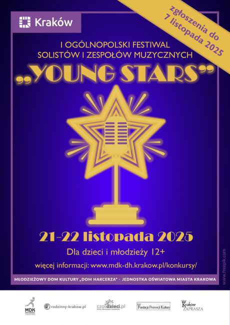Młodzieżowy Dom Kultury „Dom Harcerza” Reymonta 18 w Krakowie serdecznie zaprasza do udziału w I edycji Festiwalu „Young Stars” – wyjątkowym wydarzeniu, którego celem jest prezentacja talentów muzycznych młodych artystów z całej Polski.