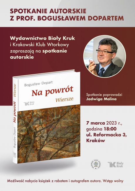 Zapraszamy serdecznie na spotkanie autorskie z prof. Bogusławem Dopartem, autorem tomiku wierszy „Na powrót” wydanym nakładem Wydawnictwa Biały Kruk. Wieczór autorski odbędzie się 7 marca o godz. 18.00 w Krakowskim Klubie Wtorkowym przy ul. Reformackiej 3.