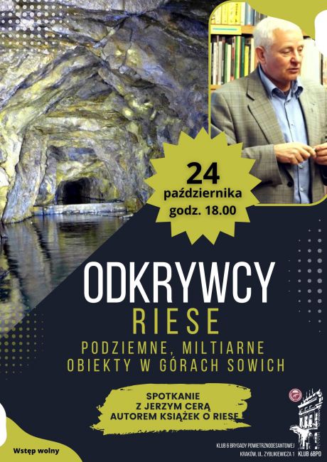 Serdecznie zapraszamy 24 października br. o godz. 18.00 wszystkich tropicieli tajemnic i badaczy historii oraz pasjonatów górskich wypraw, na cykl spotkań o tajemnicach jakie skrywają Góry Sowie. Jerzy Cera opowie o swoich poszukiwaniach i badaniach związanych z podziemnym kompleksem RIESE wykutym w Górach Sowich na Dolnym Śląsku.
